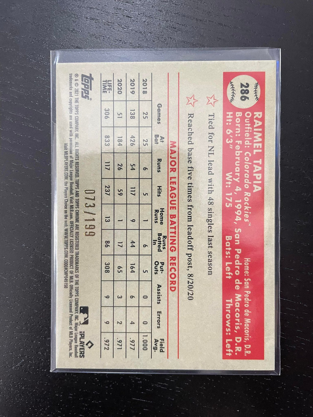 2021 TOPPS CHROME PLATINUM ANNIVERSARY - BLUE MINI DIAMOND - R. TAPIA - #286 - #'D/199