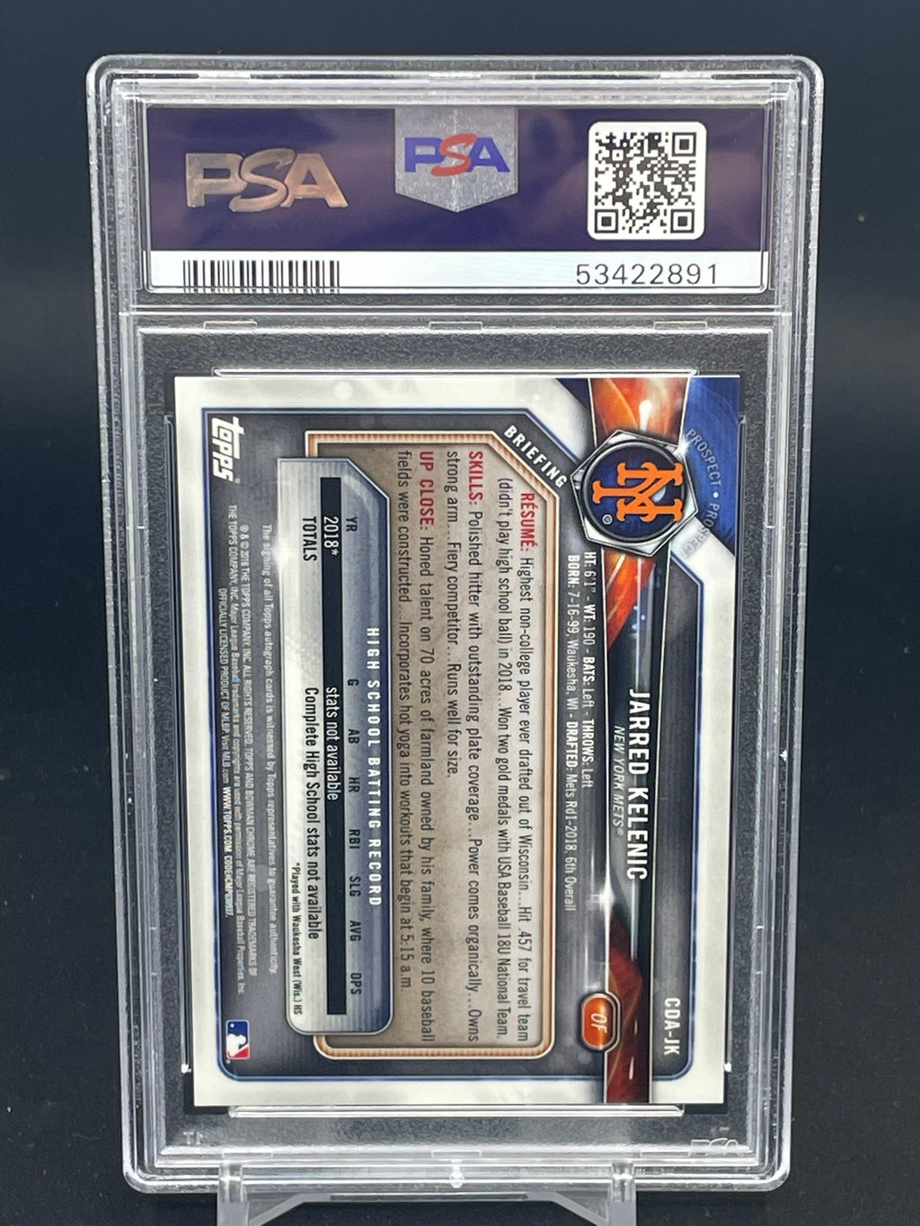2018 TOPPS BOWMAN DRAFT - CHROME DRAFT PICKS AUTO 1ST BOWMAN - J. KELENIC - #CDAJK - PSA 9 - AUTOGRAPH